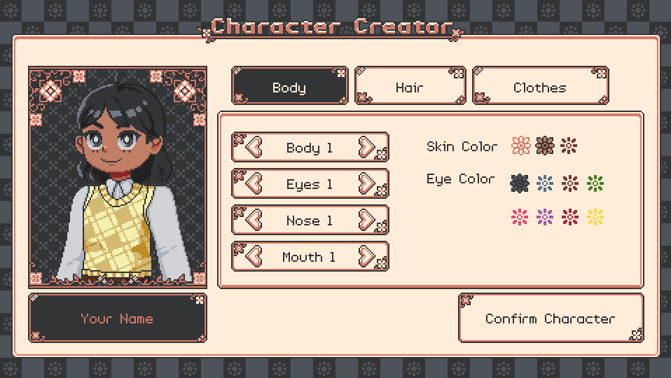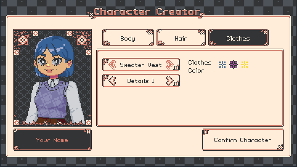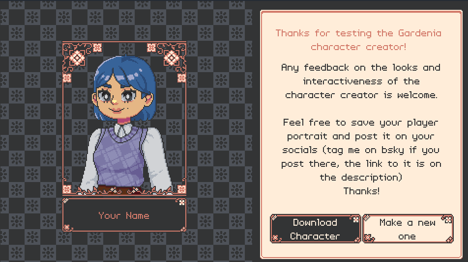 Gardenia is a project inspired by another game I've made with the same name, but this time I planned to make things more complex. This time I added a character creator, mostly because I wanted to learn how to make one, but also because I wanted to add more in game rewards, in this case, additional character design features. I'm still not satisfied with the way the character creator looks which is why I'm opening it up for testing. I do feel like some design choices were made in consequence of the fact that I'm a solo dev and artist and others because I was in a rush to start working on the main game cycle. By releasing the character creator first I can get feedback that will help me fix details and provide better additions to it (while I focus on making the core gameplay loop).